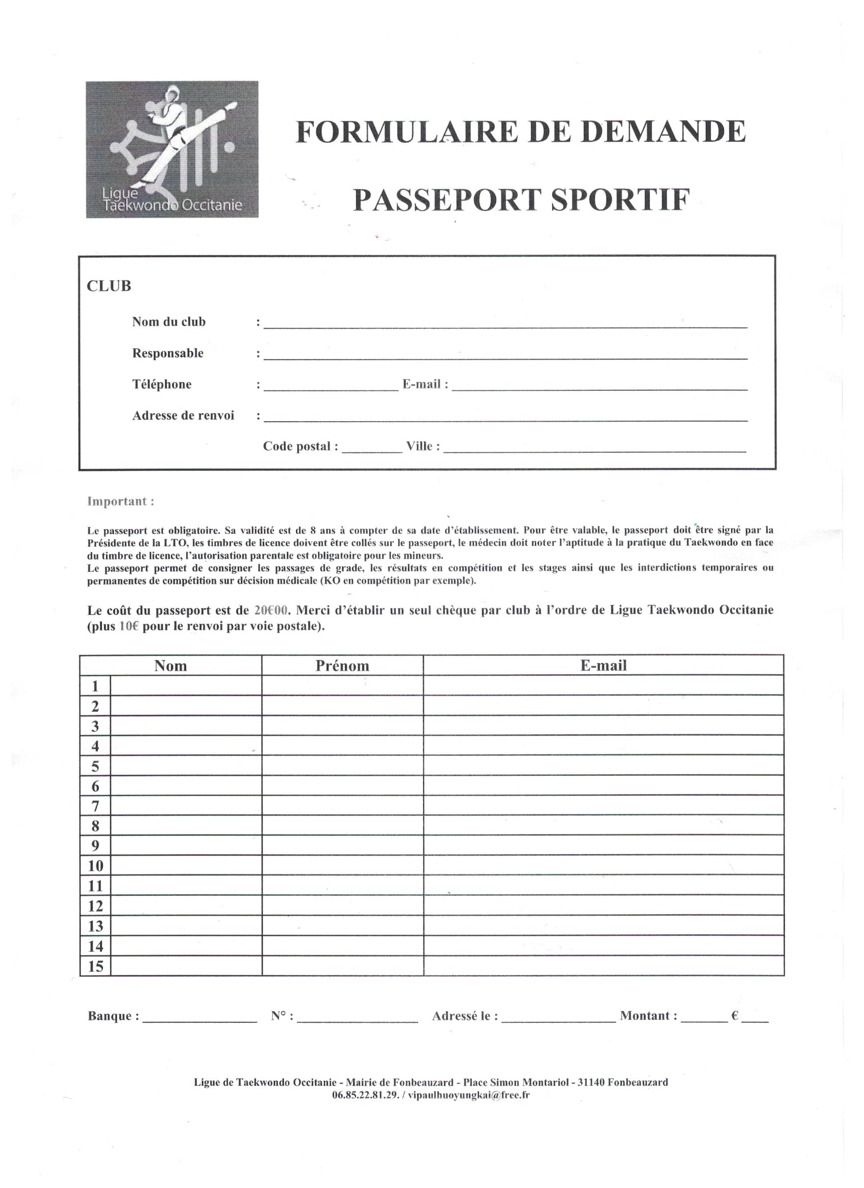 Formulaire de demande de passeport sportif