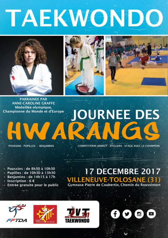 Veuillez trouver ci-joints, la circulaire, l’affiche et le fichier d’inscription (avec 2 onglets: Fichier d’inscription et bordereau de versement) , pour la Journée des Hwarangs, qui se déroulera le dimanche 17 décembre 2017 à Villeneuve-Tolosane (31).