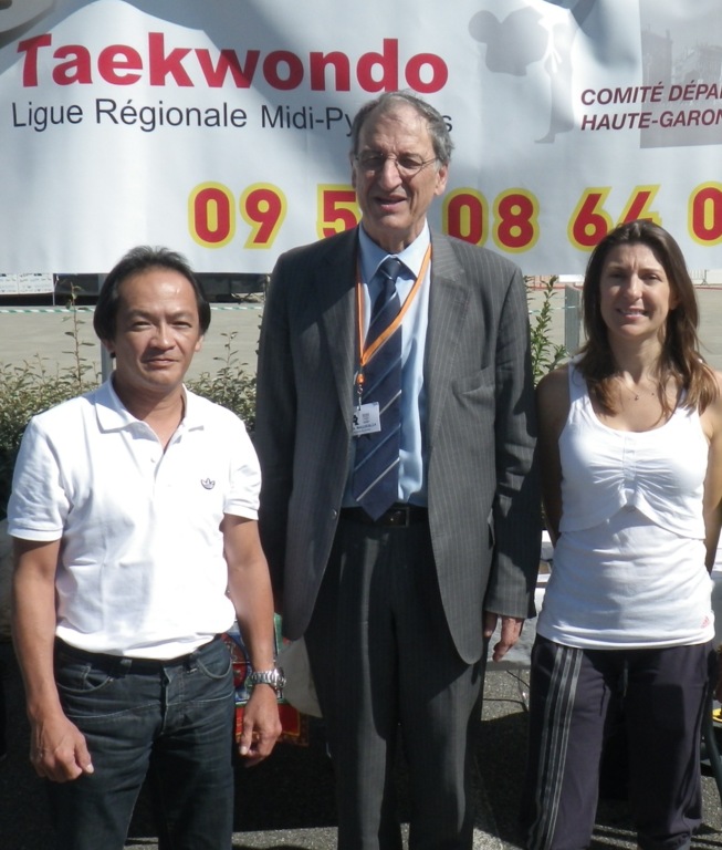 Photo: Denis Masseglia, Président du CNOSF vient saluer la Présidente de la ligue Midi-Pyrénées Carole Laforêt et le DTR, Vipaul Huo Yung Kai.
