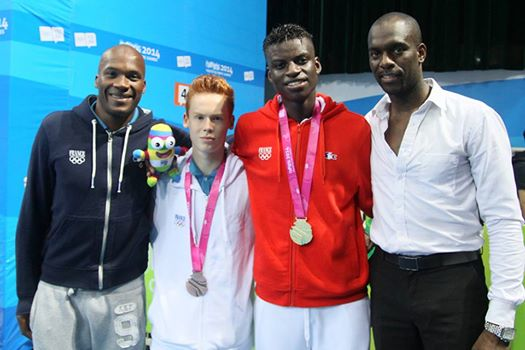 Photo: Yoann Miangue et Stéphane Audibert, respectivement médaillés d’or et de bronze aux JOJ, entourés des deux grands champions Mickaël Borot (leur entraîneur à l’INSEP) et Pascal Gentil.