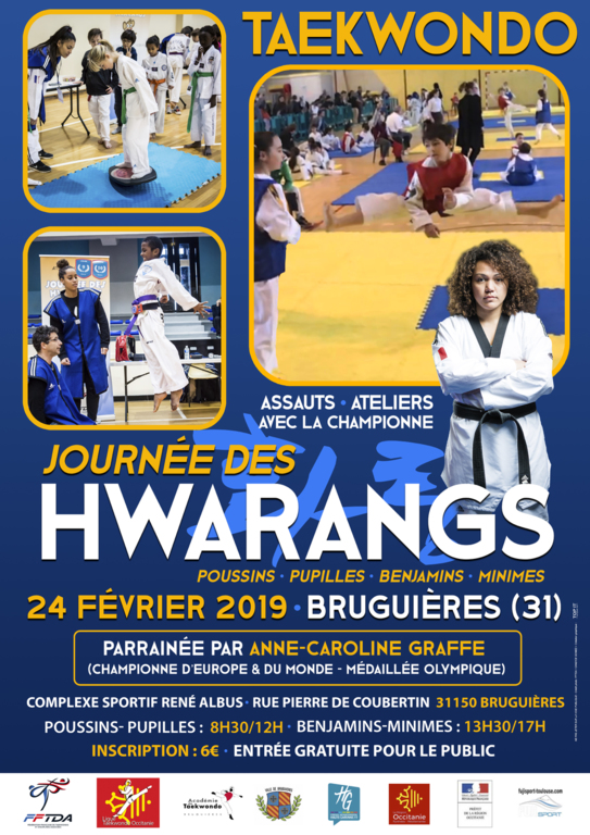 Cette journée destinée aux publics poussins-pupilles-benjamins-minimes, sera parrainée par la championne Anne-Caroline Graffe, et sera rythmée par 3 temps forts (assauts sans touche par poule, ateliers des Hwarangs et séquences d’entraînement avec la championne).