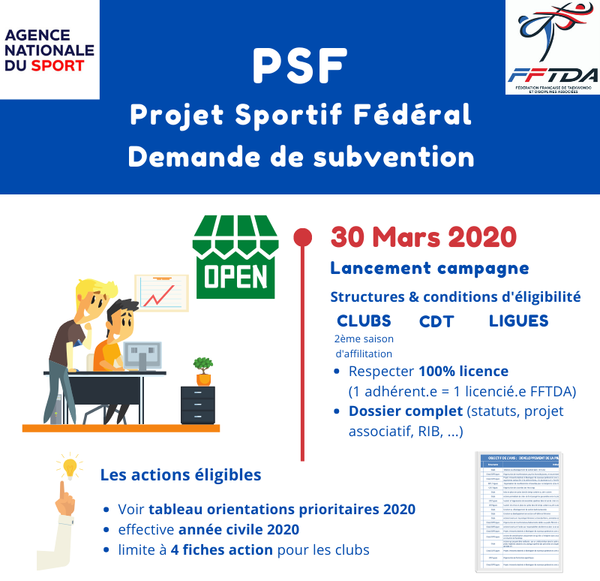 La campagne de subvention PSF 2020 destinée aux clubs, comités départementaux et ligues, débutera le lundi 30 mars 2020 jusqu’au mardi 28 avril 2020 minuit, via le Compte Asso. Toutes les informations sur cette subvention sont précisées dans la Note de cadrage PSF 2020.